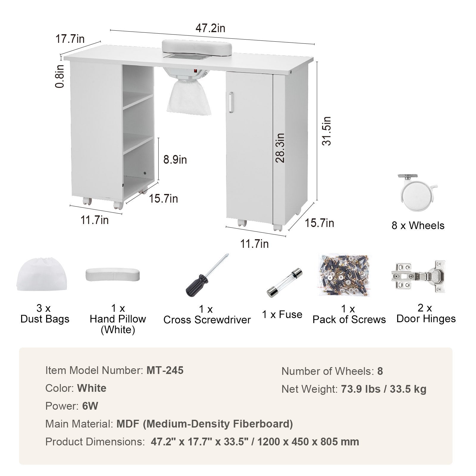 Specifications: Weight: 36.7kg | Material: MDF | Color: White | Includes: Electric dust collector, 3 dust bags, wrist rest cushion, 8 wheels (4 lockable)